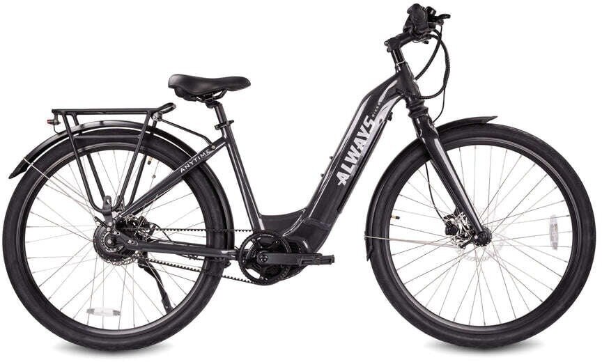 The ALWAYS Bikes Anytime is a sleek, commuter-style e-bike designed for everyday riding and errands. It features a comfortable step-through frame with front suspension, a 500?W mid-drive motor, and a continuously variable planetary transmission that ensures smooth, effortless riding. Equipped with a low-maintenance carbon belt drive and sealed transmission, it offers a clean and reliable ride. The Anytime delivers a top assisted speed of 28?mph and a pedal-assist range of up to 75?miles, making it a capable choice for serious commuting.